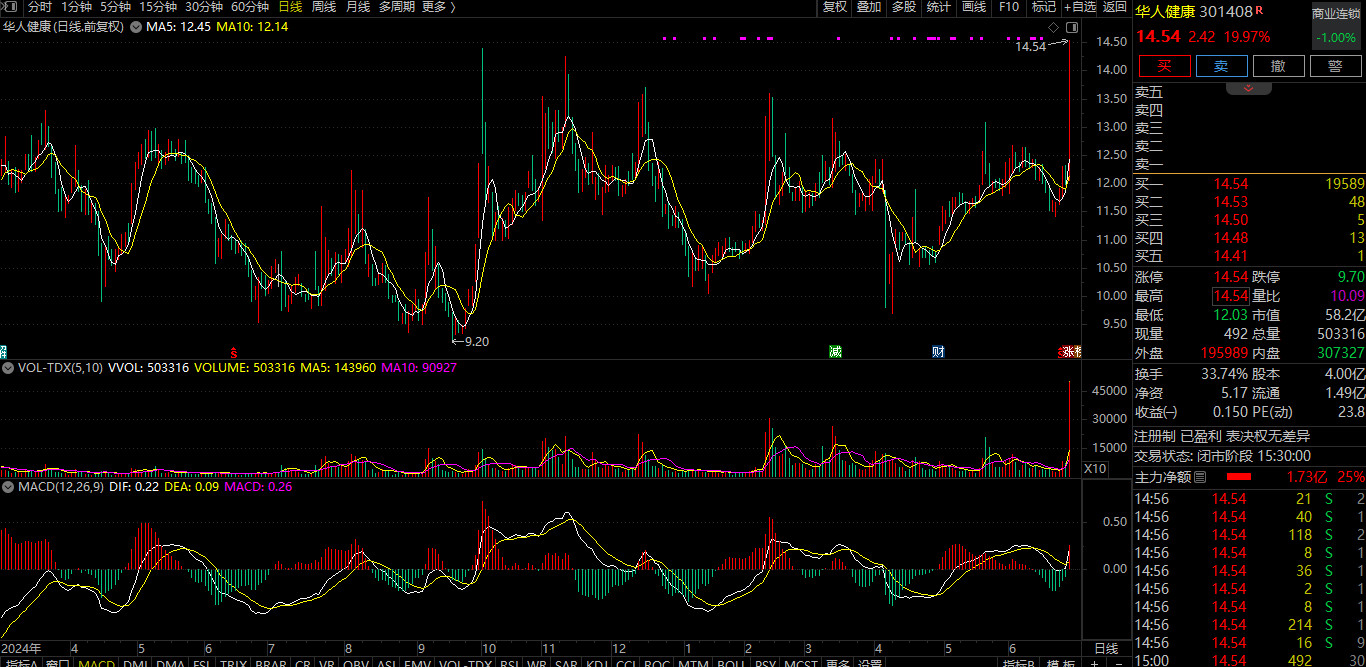 华人健康(20cm)即将阶段新高,盘中观察